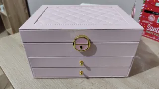 Elegante portagioie di grandi dimensioni, perfetto come idea regalo. - Finitura trapuntata sulla parte superiore. - Chiusura a lucchetto con inserto rosa. - Due cassetti con pomelli dorati.