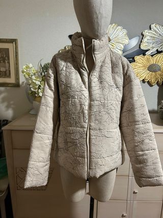 Elegante piumino grigio con un collo ampio e scenografico che aggiunge un tocco di stile unico. - Taglia S - Design moderno e accattivante. - Chiusura frontale con zip. - Maniche lunghe.