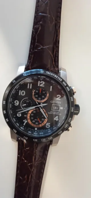 Elegante orologio Citizen con cinturino in pelle marrone. - Quadrante nero. - Funzione radio controllata. - Tecnologia Eco-Drive.