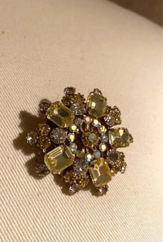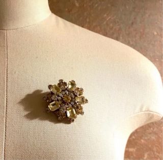 Elegante spilla Blumarine con dettagli luminosi. - Cristalli taglio rettangolare color giallo. - Montatura color oro. - Decorazioni con piccoli cristalli trasparenti e colorati.