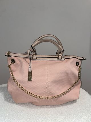 Elegante borsa a spalla con un design raffinato. - Materiale testurizzato rosa. - Manici e dettagli in ecopelle color crema. - Catena dorata decorativa. - Targhetta logo dorata.