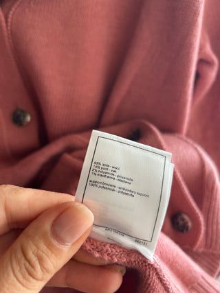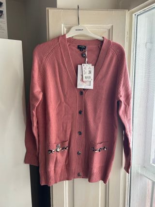 Elegante cardigan Chanel in color rosa, perfetto per aggiungere un tocco di classe al tuo guardaroba. - Modello con scollo a V. - Chiusura frontale con bottoni. - Tasche applicate sul davanti. - Dettagli decorativi sulle tasche.