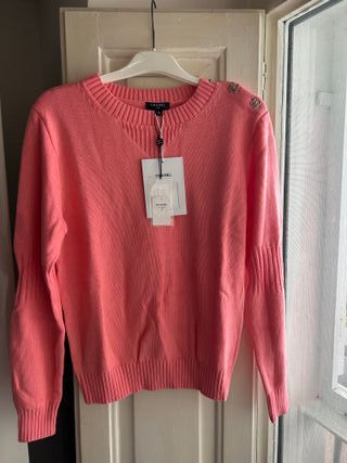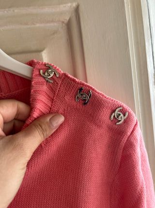 Elegante maglione Chanel in una vivace tonalità rosa. Presenta dettagli con bottoni sulle spalle. - Design a girocollo. - Maniche lunghe. - Orlo e polsini a costine.