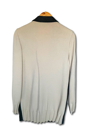 blazer firmato Calzedonia, un pezzo versatile e particolare che unisce l'eleganza di una giacca alla comodità di un cardigan. Il corpo principale è in tessuto grigio scuro melange (effetto lana/spigato), mentre il retro e le maniche sono in morbida maglia color panna/crema. Caratteristiche: Chiusura frontale con un unico bottone. Tasche laterali a filo. Dettaglio logo metallico sulla tasca. Polsini lavorati a costine. Perfetto per l'ufficio o per un look casual chic. Sta benissimo con un paio di jeans scuri o dei leggings in pelle e un tronchetto. È il capo ideale per le mezze stagioni!