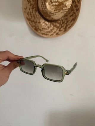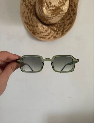 Occhiali da sole con montatura squadrata. - Montatura verde traslucido. - Lenti sfumate grigio. - Dettagli dorati sulle aste.
