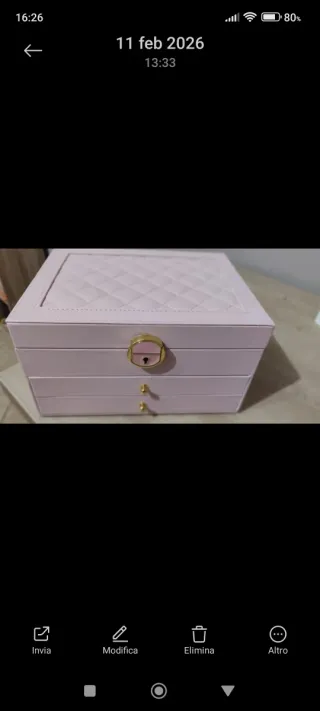 Elegante portagioie con un design trapuntato sulla parte superiore. Ideale per conservare i tuoi gioielli. - Finitura trapuntata sulla parte superiore. - Dettagli metallici dorati.