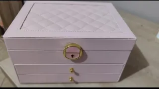 Elegante portagioie, perfetto come idea regalo. - Finitura trapuntata sulla parte superiore. - Chiusura con lucchetto dorato e inserto rosa. - Tre cassetti con pomelli dorati.