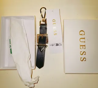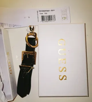 Portachiavi Guess in ecopelle nera, con dettaglio fibbia dorata. - Logo Guess triangolare. - Moschettone dorato per aggancio. Nuovo, ancora con pellicole e con confezione originale completa.