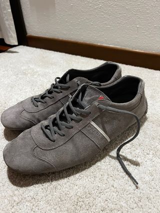 Eleganti scarpe da uomo Prada in camoscio grigio modello Montecarlo. Tenute benissimo. Veste taglia 44 anche essendo un 43,5. - Materiale scamosciato di alta qualità. - Design classico e raffinato. - Dettaglio logo Prada.