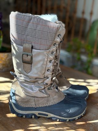 Stivali invernali Overland con un design accattivante. - Tomaia in tessuto con dettagli in plaid. - Fodera interna in pelliccia sintetica. - Chiusura con lacci e fibbia. - Suola in gomma antiscivolo. Bellissimi e caldissimi stivali invernali Overland col marrone con finiture in pelle scamosciata, fibbie metalliche laterali e inserto in tessuto a quadri, pelliccia interna. Nuovi, con cartellino #stivalidonna #overland #stivaliinvernalidonna38