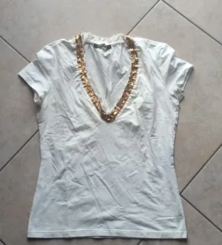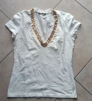 Canotta elegante Roberto Cavalli con dettagli luminosi. - Scollo a V decorato con paillettes dorate. - Tessuto bianco morbido e confortevole.