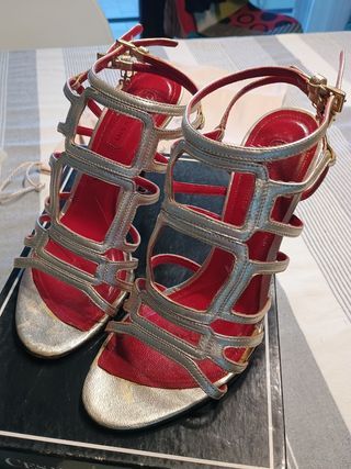 Stupendo sandalo a gabbia in pelle color oro. Originale Cesare Paciotti. N .37 comodo. Tacchi a spillo 10 cm leggermente usurati. Nella confezione originale ricambi per i sopra tacchi e custodia in tessuto firmata.