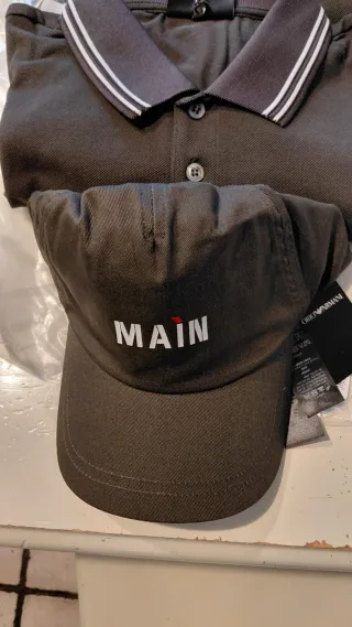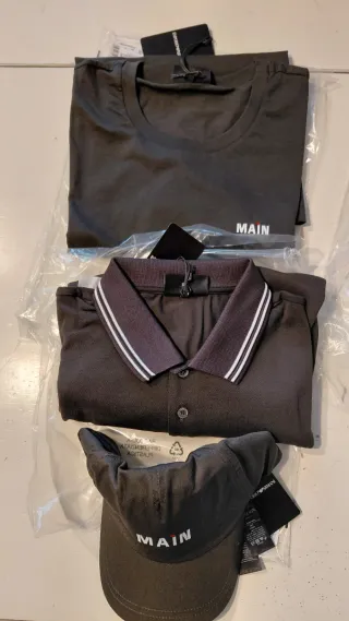 Set composto da t-shirt, polo e berretto. - T-shirt con logo MAIN bianco. - Polo con colletto a righe bianche e nere. - Berretto con logo MAIN bianco.