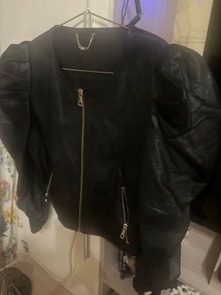 Elegante giacca da donna in pelle. - Maniche a sbuffo. - Chiusura centrale con zip. - Tasche laterali con zip.