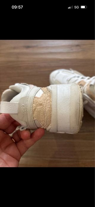 Scarpe da ginnastica Nike Dunk High numero 38.5 in ottime condizioni, pari al nuovo, singolo diffetto come mostrato in foto una piccola riga, nel resto perfette. Molto comode e leggere, interni perfetti senza nessuno rotture e puliti, esterno ottimo, suola in perfetto stato. - Tomaia in pelle beige e bianca. - Dettagli rossi. - Suola in gomma.