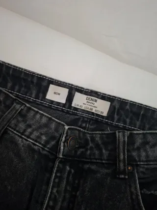 Jeans neri con un particolare effetto stone washed che dona un look unico. - Vestibilità comoda - Vita alta - Chiusura con zip e bottone