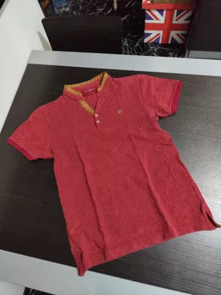 Maglietta da uomo Armand Thiery Company. - Colore rosso vivace. - Tessuto con una trama particolare. - Collo alla coreana con bottoni. - Maniche corte.