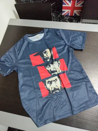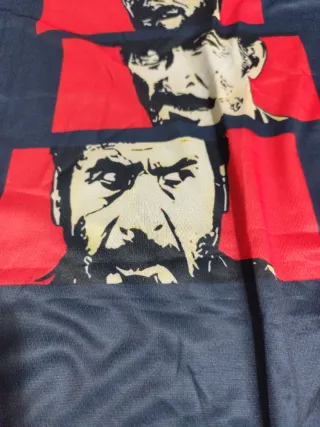 Maglietta con stampa ispirata al film Il Buono, il Brutto, il Cattivo. - Design con i volti dei tre protagonisti. - Colore base blu scuro. - Stampa grafica in rosso e beige.