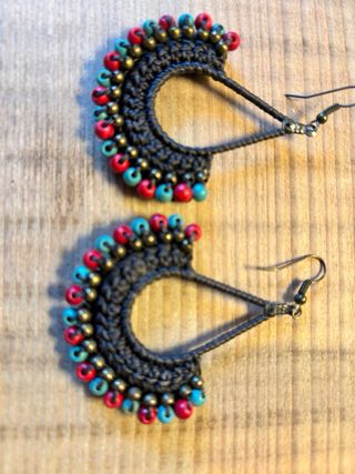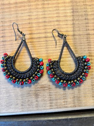 Orecchini artigianali in stile gitano, perfetti per aggiungere un tocco di colore. - Decorati con perline rosse e turchesi. - Montatura in metallo scuro. - Design a ventaglio.