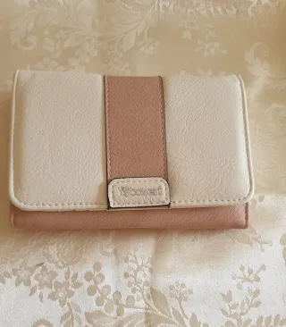 portafoglio compatto con cerniera in stile crochet/lavorato a maglia con cordino di colore beige , caratterizzato da un tessuto intrecciato che ne ricopre l'esterno. Dotato di una singola cerniera lampo che si estende su tre lati per una facile apertura. L'interno mostra diversi scomparti per carte e contanti, con fodera in tessuto liscio di colore chiaro . È nuovo però presenta delle macchioline come si vede in foto.