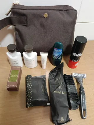 Borsa da viaggio BVLGARI per uomo, in tonalità marroni e interno verde. Include vari articoli per l'igiene personale. - Due piccole bottiglie di lozione BVLGARI Man. - Un flacone di colonia. - Un tubetto di crema BVLGARI. - Un deodorante Rexona Men Ice Cool. - Un barattolo di schiuma da barba Gille. - Un kit dentale da viaggio. - Un rasoio Gillette. - Un pettine. - Fazzoletti.