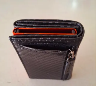 Elegante portafoglio da uomo con un design moderno. - Materiale esterno effetto carbonio. - Dettagli interni in colore arancio vivace. - Tasca esterna con zip. - Pop-up Porta Carte di Credito con Protezione RFID. -Portamonete e Scomparti Banconote.