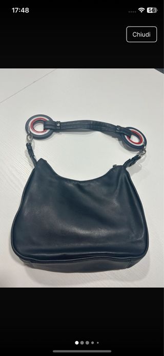 1. Nome Borsa a tracolla Diesel in pelle nera con hardware argentato. 2. Condizione Buone condizioni (con segni visibili ma discreti di utilizzo). Alcune abrasioni e ossidazione sulla chiusura frontale e alcuni leggeri segni all'interno, tipici delle borse in pelle usate. 3. Misure Larghezza: 21 cm, Altezza: 16 cm, Profondità: 7 cm, Tracolla: Catena regolabile + pelle. 4. Descrizione Una borsa a tracolla Diesel urbana ed elegante realizzata in morbida pelle nera con accenti in pelle testurizzata sul pannello superiore. Le audaci cerniere e la catena in metallo argentato le conferiscono un atteggiamento moderno e deciso. Pratici scomparti doppi con cerniera e tasche interne.