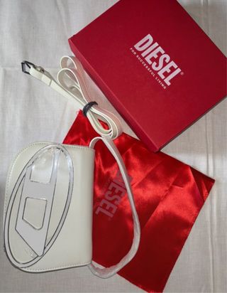 Borsetta Diesel in pelle, dal colore bianco panna. - Logo Diesel in rilievo sul davanti. - Tracolla regolabile. Per maggiori informazioni non esitare a contattarmi :)