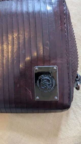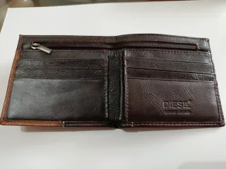 Portafoglio della marca Diesel, con un design moderno e funzionale. Colore marrone con dettagli argentati. Chiusura con cerniera completa per un accesso sicuro.