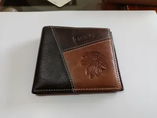 Portafoglio in pelle con design patchwork. - Nuovo nella sua scatola - Dimensioni 10 x 11 - Pelle autentica - Ideale come regalo - Combinazione di pelle marrone e nera - Dettaglio di cuciture bianche - Incisione di un design tribale sul risvolto