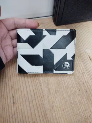 Portafoglio con un accattivante design geometrico in bianco e nero. Presenta un distintivo stampato e il logo Diesel visibile. Capacità per carte su entrambi i lati e per contanti. È in buono stato generale ma non è completamente nuovo. Guarda le foto.