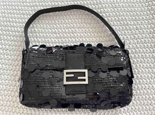 Iconica borsa Fendi modello Baguette, perfetta per aggiungere un tocco di glamour. - Rivestimento completo di paillettes nere. - Dettaglio con log argentato. - Tracolla in pelle nera. (Un’altra più lunga inclusa)