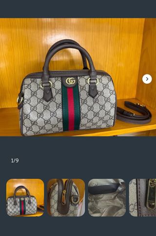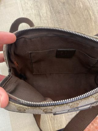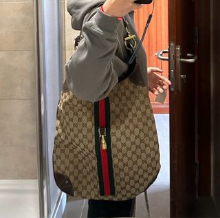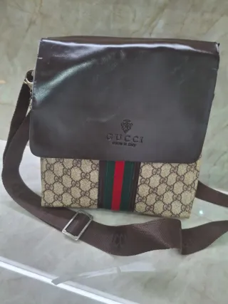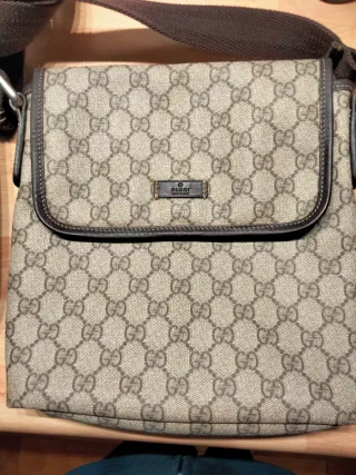 La borsa Reins presenta un corpo in tela loggato gg con una tasca interna con chiusura a zip, cucito c’è il marchio che delinea la sua originalità con il suo numero seriale 114877 2123, un rivestimento esterno in tessuto Kaki scuro e in pelle con logo G foderato, un manico arrotolato in pelle con un gancio in centro al manico, la chiusura è tramite calamita, presenta alcuni segni dovuti all’usura del tempo e utilizzo ma ancora in eccellente stato ( vedi foto ) dimensioni: lunghezza: 33 cm Larghezza: 22 cm senza tracolla e 37 con tracolla profondità: 5 cm, è inclusa la sua busta antipolvere originale color: Marrone Materiale: Tessuto