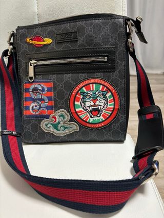 Bandolera del marchio Gucci in colore nero, con un design unico adornato con patch. - Caratteristico motivo GG del marchio. - Chiusura con cerniera. - Tracolla regolabile con dettagli a righe. - Vari patch decorativi a tema.