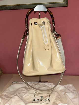 Borsa Gucci Diana Bucket Bag originale, un modello iconico grazie al suo manico in bambù, uno dei dettagli più riconoscibili della casa italiana dal 1947. Design a secchiello comodo e leggero con grande capacità. Può essere usato a tracolla o a mano!!! Dettagli Marca: Gucci Modello: Diana Bucket Bag Materiali: Vernice + manico in bambù + cinturino in pelle Colore: Beige / Crema Origine: Fatto in Italia Accessori: Dustbag originale Ottime condizioni. Piccoli segni scuri sulla vernice (vedere le foto) Borsa autentica. Viene con certificato! PREZZO TRATTABILE