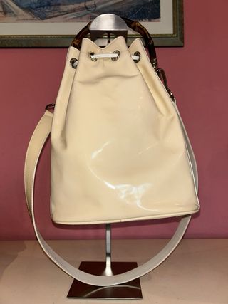 Borsa a mano e tracolla del marchio Gucci. Combinazione di colori beige e nero. Dettaglio di catena dorata. Chiusura con fibbia. Include etichetta in pelle. Nuova.