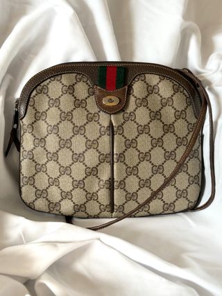 Borsa vintage del marchio Gucci con un design classico. - Caratteristico motivo GG. - Tracolla centrale con i colori verde e rosso. - Dettagli in pelle marrone.