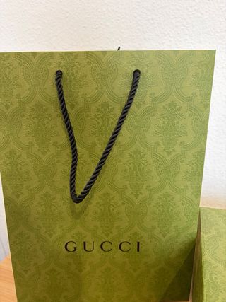 Questa è la confezione originale del marchio Gucci. Include una borsa di carta e una scatola. Design con il motivo caratteristico del marchio. Dimensioni: 26 x 35 x 14 cm (borsa di carta) e 27 x 11,5 x 21,5 cm (scatola).