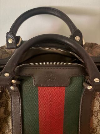 Elegante borsa Gucci con il classico motivo GG. - Motivo GG all-over - Striscia verde e rossa centrale - Dettagli in pelle marrone -Zip mancante -Molte usure da riparare.Da qui il piccolo prezzo.
