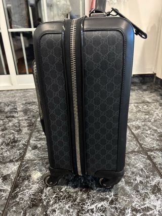 Valigia elegante del marchio Gucci. Colore nero con dettagli dorati. Design distintivo del marchio.
