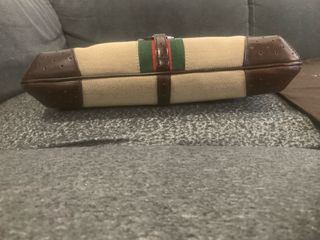Autentico borsello vintage Gucci in tela GG Supreme con tricolore verde e rosso e dettagli in pelle marrone. Presenta lievi segni d'uso: leggero sbiadimento sui bordi, interno leggermente screpolato ma ancora morbido e piccoli graffi sul logo. Per la sua età, è in ottime condizioni. Include la custodia originale. #gucci #guccivintage Misure: Alto 19 cm, Larghezza 23 cm, Lunghezza della tracolla 60 cm.