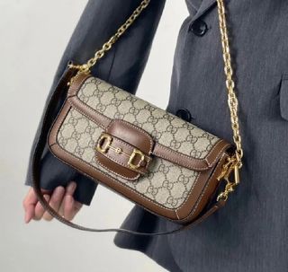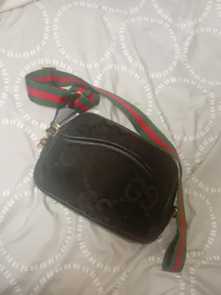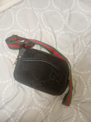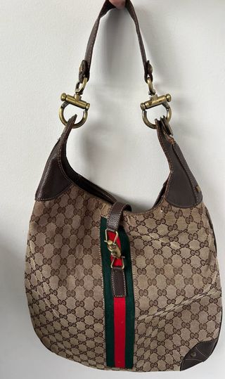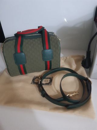 Borsa del marchio Gucci con un design classico ed elegante. - Caratteristico motivo GG del marchio. - Distintiva striscia verde e rossa. - Hardware dorato con logo GG. - Tracolla regolabile per il trasporto a spalla.