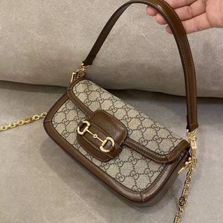 Elegante mini borsa del marchio Gucci. Design classico con il monogramma GG. Dettagli in pelle marrone. Distintiva riga verde e rossa.