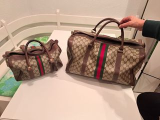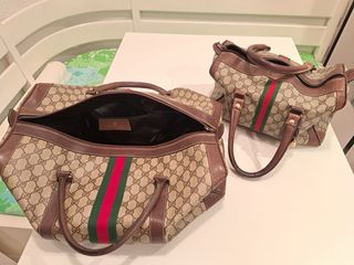 Set di due borse da viaggio con il distintivo design del marchio. Design classico con strisce verdi e rosse. Finitura in pelle sintetica con monogramma. Manici superiori e dettagli in pelle. Dimensioni della borsa grande.