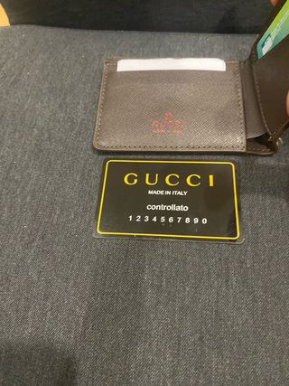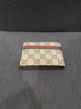 Portafoglio Gucci originale, con il classico motivo GG. - Motivo GG all-over. - Striscia verde e rossa. - Angolo leggermente rovinato.