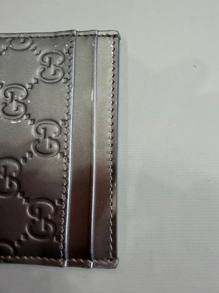 Elegante portacarte Gucci con iconico monogramma. - Finitura metallizzata. - Design in rilievo.