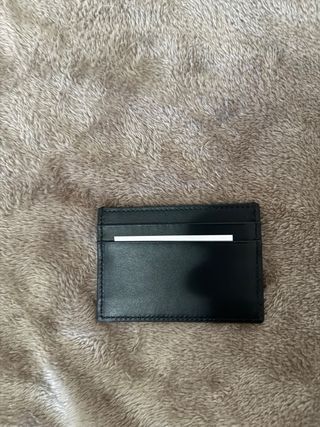 Elegante portacarte Gucci in pelle nera, con dettagli dorati. - Design minimalista e funzionale. - Logo Gucci impresso a caldo.