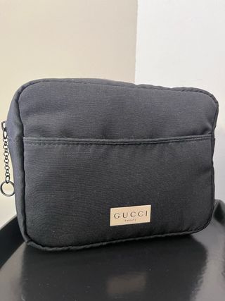 Bellissimo beauty-case Gucci in stoffa e rifiniture in pelle, utilizzabile sia in viaggio che in esposizione in bagno con i propri prodotti. nuovo e mai utilizzato, misure 16x22x18. Prezzo introvabile!