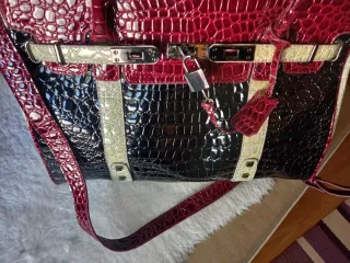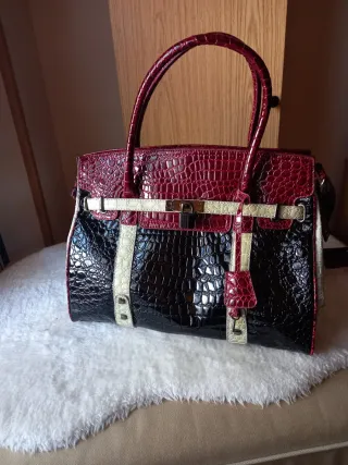 Borsa elegante in stile Hermes, con finitura scintillante e design a tre tonalità, marca Volum del Corte Ingles. Materiale: pelle scamosciata. Design: imitazione pelle di coccodrillo. Chiusura: metallica con chiave. Dettaglio: ciondolo abbinato.