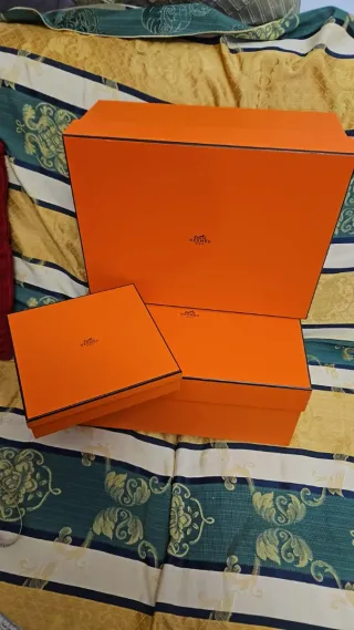 Set di scatole del marchio Hermes Paris. Colore arancione caratteristico. Logo del marchio visibile.